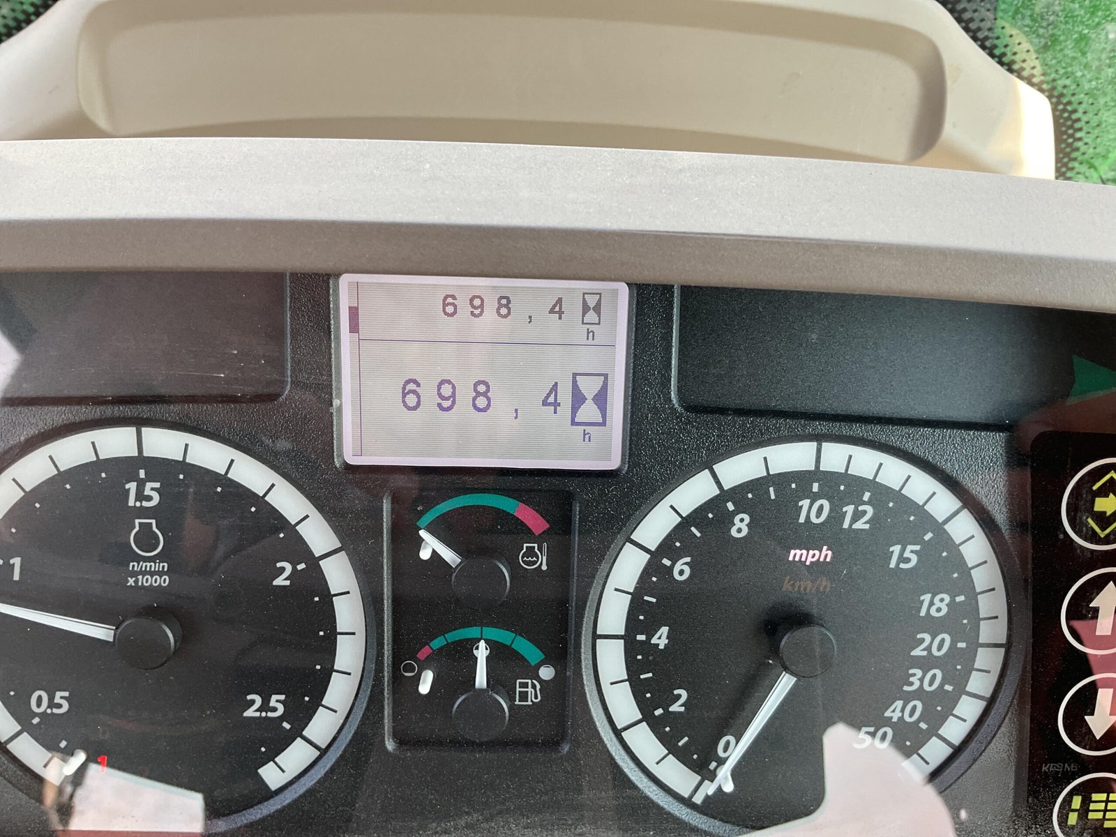 Comfortable cab with A/C, heat, suspension seat, buddy seat, and AM/FM/WB radio. Features joystick loader controls with grapple switch, single-point cam-over hydraulic hookup, and H310 quick-attach loader with 7’ Euro-mount bucket and 5-tine hydraulic grapple fork. Also includes front hydraulic outlet, grill guard, and weld-on cutting edge.